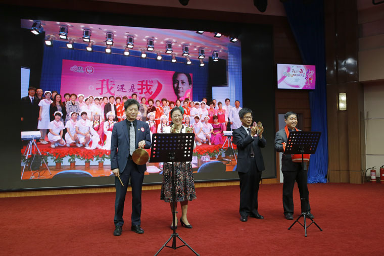 河北省抗癌協(xié)會(huì)副理事長(zhǎng)、我院副院長(zhǎng)耿翠芝和劉運(yùn)江兩位教授分別講話。他們回顧了康馨家園風(fēng)雨10年的艱辛歷程,也現(xiàn)場(chǎng)普及了科學(xué)抗癌、報(bào)團(tuán)取暖的防癌抗癌知識(shí),更對(duì)現(xiàn)場(chǎng)參與活動(dòng)的人員寄予厚望和祝福!接著便是精彩的醫(yī)護(hù)人員和患者團(tuán)隊(duì)自編自演的聯(lián)歡活動(dòng),參加活動(dòng)的有84歲高齡奶奶的新疆舞蹈、有癌齡將近10年直腸癌患者、更多的是乳腺癌病友們,來(lái)自邢臺(tái)沙河市乳腺癌快樂(lè)家園的乳腺癌病友們也友情出演“孫氏太極拳”。耿翠芝、劉運(yùn)江、宋振川和李海平4位教授也聯(lián)袂登臺(tái)表演三句半,更有乳腺中心漂亮美麗的青年護(hù)士表演的壓軸大戲手語(yǔ)節(jié)目“感恩的心”。醫(yī)院會(huì)場(chǎng)溫馨動(dòng)人、場(chǎng)景令人動(dòng)容,作為醫(yī)者,看到我們親治的患者如此好的心理身體康復(fù),內(nèi)心無(wú)比欣慰!