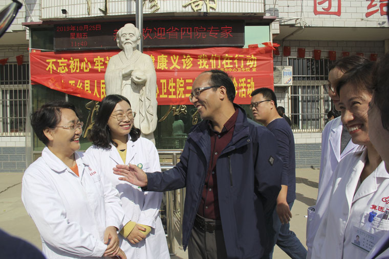 他們一行先到達(dá)平鄉(xiāng)縣醫(yī)院,與醫(yī)院黨委書記史贊濤和副院長史風(fēng)超就對口支援工作進(jìn)行了座談,史贊濤書記對我院派駐隊員的支援工作給予了高度評價,并就下一步的幫扶工作進(jìn)行深入討論。座談會中,趙孝先處長了解到我院9名派駐人員恰逢到平鄉(xiāng)中心衛(wèi)生院下鄉(xiāng)義診,遂在史贊濤書記帶領(lǐng)下,他們一行到達(dá)義診現(xiàn)場實(shí)地調(diào)研。趙孝先處長、邢鵬輝副處長與平鄉(xiāng)縣醫(yī)院相關(guān)派駐科室主任就科室現(xiàn)狀、幫扶需求等進(jìn)行了交流。義診結(jié)束后,趙孝先處長與派駐隊員進(jìn)行了座談,對派駐隊員表示慰問并強(qiáng)調(diào)對口支援工作的重要性,要求派駐人員嚴(yán)守下鄉(xiāng)紀(jì)律,注重幫扶實(shí)效,做好下一步幫扶計劃,認(rèn)真總結(jié),做到“扶真貧、真扶貧”。