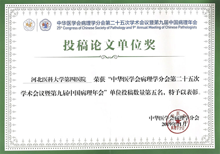 11月14至17日,中華醫(yī)學(xué)會(huì)病理學(xué)分會(huì)第二十五次學(xué)術(shù)會(huì)議暨第九屆中國(guó)病理年會(huì)在河南省鄭州市舉行。我院病理科及細(xì)胞學(xué)室投稿共131篇,居全國(guó)第五名。大會(huì)發(fā)言7人次,壁報(bào)交流34篇,書面交流91篇,其中3篇壁報(bào)被評(píng)為“優(yōu)秀壁報(bào)”。我院被大會(huì)授予“投稿論文單位獎(jiǎng)”,在論文投稿的質(zhì)和量上得到了國(guó)內(nèi)同行的一致贊譽(yù),為我院在全國(guó)病理年會(huì)上贏得了榮譽(yù)。