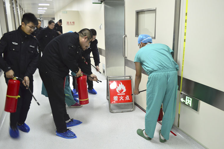演練正式開始。正在手術間巡回的李亞榮發(fā)現(xiàn)火情后第一時間在走廊大聲呼喊“著火啦!著火啦!”尋求周圍同事的幫助,同時打電話將具體起火位置告知保衛(wèi)處以及科室護士長來尋求支援。他迅速找到最近的滅火器,并按下警報按鈕,附近的同事也第一時間手提滅火器,對起火點進行噴射。保衛(wèi)處值班室人員接到電話后立刻趕到現(xiàn)場,根據(jù)火情迅速增派人員加入到火災搶救工作中。