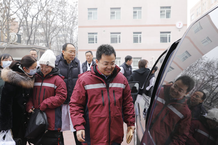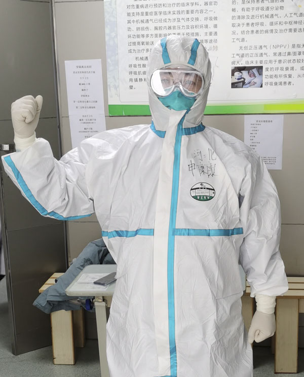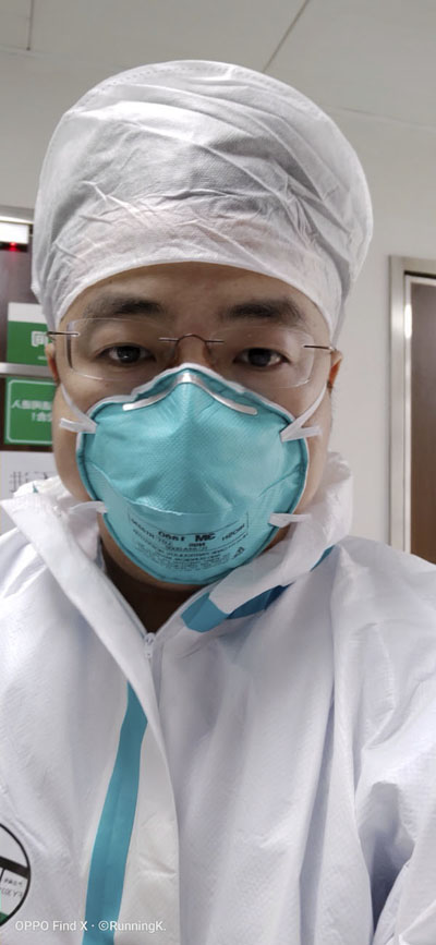 進(jìn)入病區(qū)前,大家特意在防護(hù)服上寫了名字,方便大家相互確認(rèn),也是互相鼓勁加油。我在朱桂軍主任的防護(hù)服背后,寫上了大大的字:“河北朱桂軍,加油!”