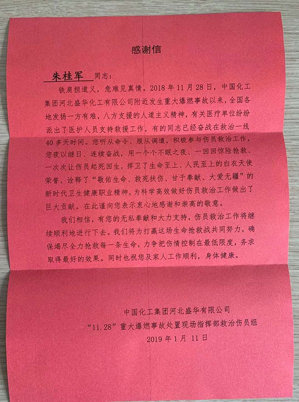 每當(dāng)省內(nèi)有重大搶救時,現(xiàn)場也總是少不了他的身影。2016年,河北省重癥H7N9患者死亡率居高不下,省衛(wèi)健委抽調(diào)他先后奔赴衡水、承德和保定指導(dǎo)并參與H7N9甲流病人的救治,挽救了大量重癥患者的生命。2017年,張家口“7.21”重大車禍發(fā)生,他親臨現(xiàn)場,指導(dǎo)并參與了重癥傷員搶救。2018年張家口“11.28”重大爆炸事故發(fā)生后,在省衛(wèi)健委的安排調(diào)度下,朱桂軍同志第一時間加入救治傷員團(tuán)隊(duì),深入一線進(jìn)行了為期長達(dá)30天的救治工作,為及時有效搶救傷員發(fā)揮了重要作用,救治傷員組臨時黨委對朱桂軍同志做出了如下評價(jià):靠得住、沖得上、打得贏,不負(fù)重托、不辱使命。