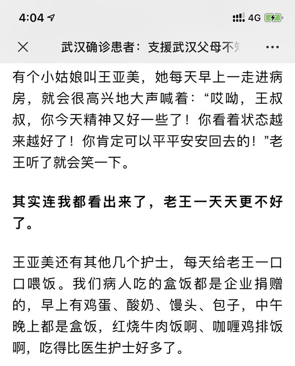 這是我院90后美小護王亞美的一篇心情日記,寥寥幾句概括了她在武漢抗疫一線23天的生活和工作,看似輕松的背后是無盡的汗水和艱辛的努力。年紀輕輕的她,和伙伴們一起,用自己的愛心、耐心和細心對待每一位患者,文中的“王叔”就是這其中的一位。恰好一篇收錄于“百家號抗擊新型肺炎專題人物欄目#戰疫日記#”中的患者自述,也寫到了她們的事跡,在這位患者的日記中,同在武漢一線的我院楊大運和王亞美她們一起,被稱為“神仙妹妹”。
