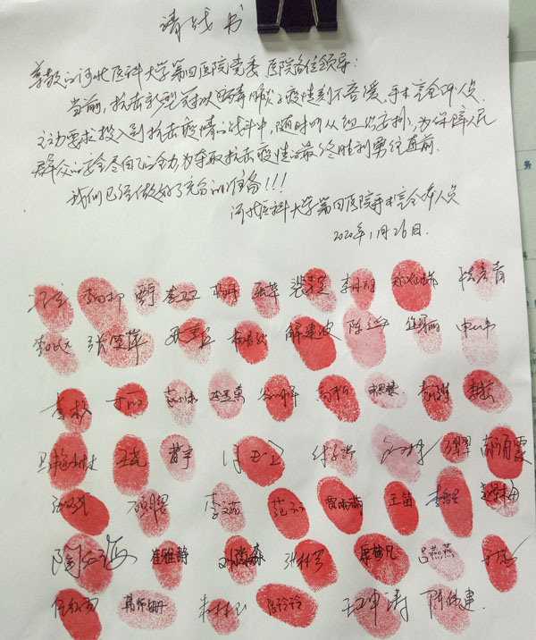 疫情就是命令,防控就是責任。在接到省衛健委和醫院黨委的通知后,手術室全體成員放棄休假,隨時準備奔赴前線。在護士長馮立帶領下,全員遞交請戰書,紛紛要求到一線去戰斗。“我自愿報名,申請加入醫院各項治療新型冠狀病毒肺炎的轉運工作”,“不計報酬,不論生死,請讓我上前線”……