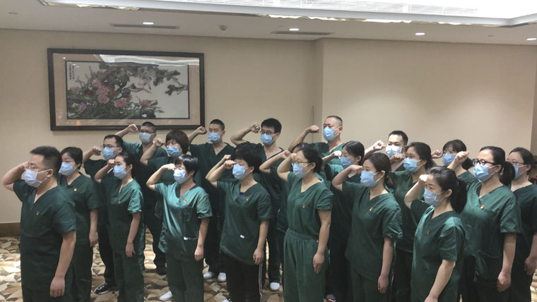 3月18日,申康康帶領河北省首批援鄂醫療隊前線新入黨同志宣誓
