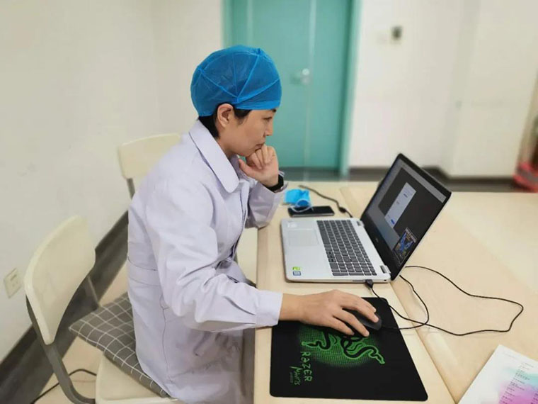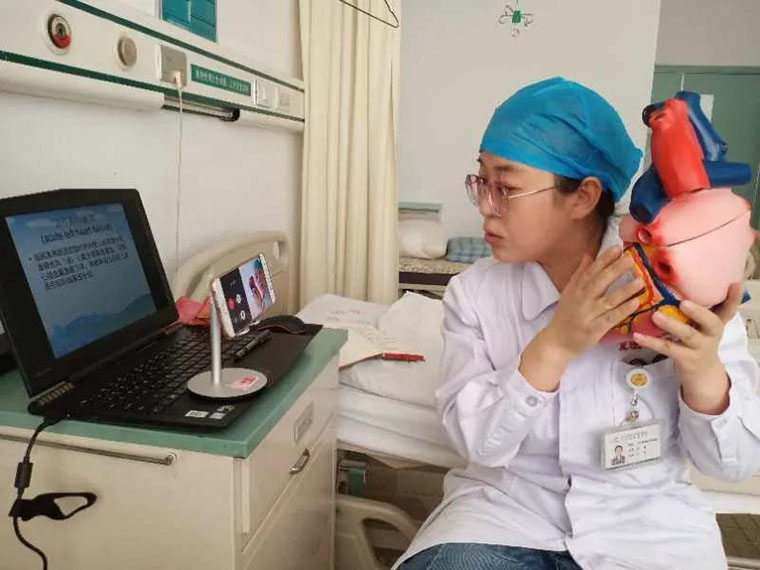 ICU護士長尹彥玲通過網(wǎng)絡(luò)教學(xué)平臺向護理三年級學(xué)生授課