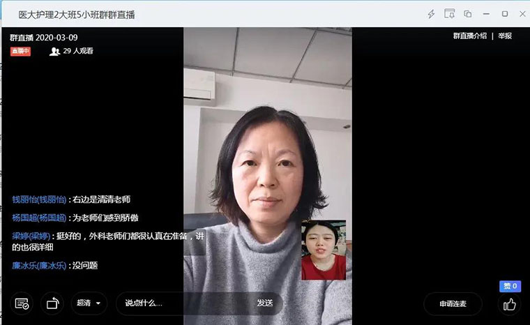 3月9日,段紅霞、吳景梅兩位老師化身“網(wǎng)絡(luò)主播”,在釘釘教學(xué)平臺上組織了線上主題班會。兩位老師與同學(xué)們通過網(wǎng)絡(luò)進行互動,了解同學(xué)們的居家生活狀態(tài)、心理狀態(tài)及線上學(xué)習(xí)情況,囑咐他們在家做好個人防護,積極完成線上實習(xí)任務(wù),同時通過我院參加疫情防控一線人員的先進事跡引導(dǎo)學(xué)生們學(xué)習(xí)與思考,積極傳播正能量。