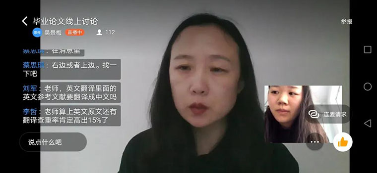 對于學(xué)生目前最關(guān)注的畢業(yè)論文事項,吳景梅老師分別于3月9日和16日兩次通過“線上面對面”的形式,對學(xué)生在論文寫作過程中出現(xiàn)的問題進行了集中答疑。同學(xué)們針對論文的結(jié)構(gòu)要求、寫作細(xì)節(jié)等方面展開提問,得到了悉心的指導(dǎo)。