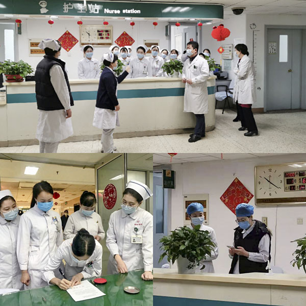 他們對病房、護士站、各值班室、醫(yī)辦室、換藥室每日通風兩次,每次30分鐘;他們使用500mg/L含氯消毒液擦拭護士站臺面、治療室操作臺、護士站電腦、打印機、椅子扶手、門把手(護士站、醫(yī)辦室、值班室)、體溫槍,每日兩次;他們使用紫外線消毒病房、各值班室,每日一次,每次0.5至1小時。他們?yōu)樽≡夯颊咝v疫情防控知識、演練七步洗手法以及如何使用快速手消液等,在保障患者醫(yī)療有序不紊進行的前提下,這些細致的消毒、手衛(wèi)生和疫情宣教工作,成為他們每日牢記于心并堅定于行的行動。他們始終以患者為中心,認真落實放五科疫情期間新住院患者診療細則,對每一位患者及家屬進行排查,保證所有在院患者及工作人員的安全。由于放療科的特殊性,他們認真登記患者及家屬出入記錄,包括床號、姓名、出入時間、去向及聯(lián)系電話,嚴格交接班。一位患者在出院時留下一張卡片:“在人人自危的疫情期間,你們織起了一張巨大的‘安全網(wǎng)’,把我們緊緊地罩在里面,讓我們覺得安心。”
