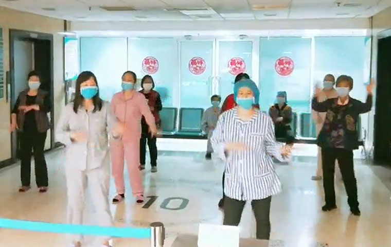 放五科主任周志國與護士長楊帆率先垂范,從年三十開始一直堅守崗位,嚴格梳理流程,妥善安排工作,給予隊員信心和勇氣。主管護師支靜作為第二批進駐發(fā)熱門診的成員,扛起責任,經(jīng)受考驗,在醫(yī)院一線默默付出。剛參加工作不滿一年的護士王路琪作為急診第一批的“守門人”,在疫情最為嚴峻的時刻為每一位進院患者及家屬檢測體溫。由于放療患者住院周期長,放五科深入關切患者的生活和情緒,幫助外出放療的患者打飯,教給年齡較大的患者用微信跟家里人視頻通話,還購置了撲克、跳棋、象棋等供患者及家屬休閑娛樂。對于一些嚴重焦慮的患者,主管醫(yī)生和護士會單獨進行心理疏導,同時開展了疫情期間醫(yī)務人員和患者的心理調(diào)查,關心他們的心理健康狀況。能歌善舞的護士李曉杰、李梅還將功能鍛煉的動作,編成了舞蹈,分批次地教給患者,在保證安全距離的前提下帶著他們一起排練,患者們學成后自發(fā)在科室中廳跳起了“廣場舞”。有一位患者在出院時,用心地為每一位工作人員準備了明信片,親筆寫下感謝。