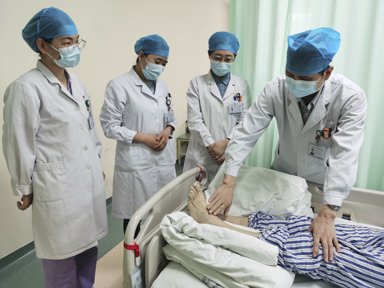 4月21日,我院內(nèi)分泌科丁海霞、劉桂紅兩位副教授為一71歲飽受足部疼痛的大爺進(jìn)行了高難度的下肢介入手術(shù),她們身披30多斤重的鉛衣,經(jīng)過3個(gè)小時(shí)的精心配合與操作,終于為患者恢復(fù)了血流,使其免除了截肢之痛。患者感到足部逐漸變暖,疼痛癥狀大為緩解。“我們費(fèi)勁周折找到這里,幸虧遇到了你們,是你們救了我的命,救了我們?nèi)野。 被颊邔晌会t(yī)生精湛的醫(yī)術(shù)連連表示感謝,眼淚瞬間奪眶而出。