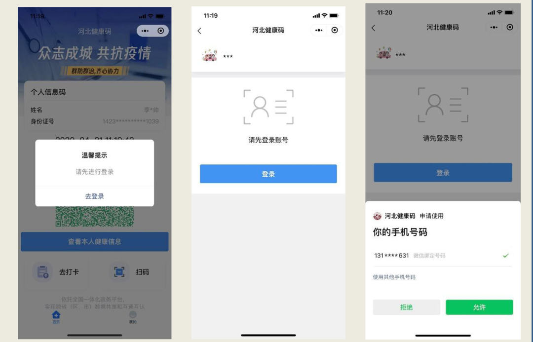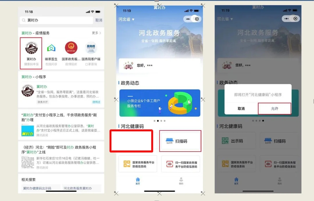 微信搜索“冀時辦”→打開“冀時辦”小程序→初次使用,需先登錄→實名認證→點擊“出示碼”按鈕→初次使用時,進行一次健康申報(去打卡)→亮出本人“健康碼”或被動掃碼→查看個人健康信息→如果提示“未見異常”可以通行→如果有紅色“提示信 息”,要進行健康狀態(tài)核驗。