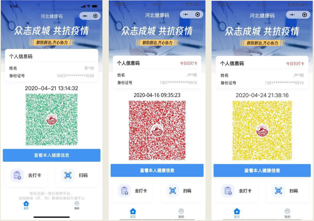 4.出示“健康碼”,供“掃碼”使用。如果顯示“綠碼”,可以通行;如果顯示“黃碼”或“紅碼”,需核實健康狀態(tài)。(顏色實例如圖)