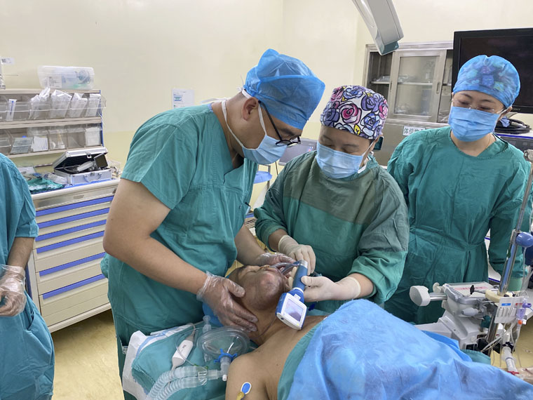 在賈慧群教授的指導(dǎo)下,給5L/min面罩吸氧去氮,以提高其缺氧耐受程度,同時(shí)進(jìn)行輕度鎮(zhèn)靜。在充分表面麻醉后,采用可視喉鏡經(jīng)口探查了解口腔結(jié)構(gòu),但因腫瘤巨大而失敗,這預(yù)示著插管更加撲朔迷離。此時(shí),專家們果斷按照預(yù)先方案開始經(jīng)鼻插管,順利進(jìn)入鼻腔后,通過纖維支氣管鏡探查口腔結(jié)構(gòu),發(fā)現(xiàn)解剖結(jié)構(gòu)混亂。賈慧群教授、李超主任沉著應(yīng)戰(zhàn),憑借嫻熟的技術(shù),在纖支鏡引導(dǎo)下,慢慢將氣管導(dǎo)管通過舌體和狹小的咽喉腔,經(jīng)過多次探查,最終找到聲門并成功置入了氣管插管。之后,他們快速推注全麻藥物,患者安然入睡,手術(shù)順利開始。