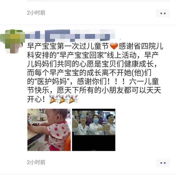 自2017年起,每到六一兒童節(jié),兒科都會邀請曾經在NICU“畢業(yè)”的寶寶們“回家”過節(jié),已經持續(xù)3年。今年受疫情影響,寶寶們通過“云”回家,體驗別樣的快樂。兒科新生兒重癥監(jiān)護室(NICU)長期致力于危重新生兒的防治及早產兒的全方位綜合管理,在提高早產兒搶救成功率的同時,非常關注他們的遠期健康,為孩子們的健康成長不懈奮斗。