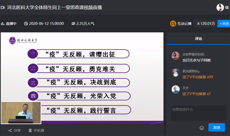 6月12日下午3點(diǎn),我院重癥醫(yī)學(xué)科病區(qū)主任朱桂軍應(yīng)邀來(lái)到河北醫(yī)科大學(xué),參與以“講述前線故事,凝聚愛國(guó)力量”為主題的復(fù)學(xué)第一課,傾情講述他的“抗疫故事”。本場(chǎng)思政課采用線上直播與線下會(huì)場(chǎng)同步進(jìn)行的方式,河北醫(yī)科大學(xué)高度重視,學(xué)校黨委書記翟海魂等校領(lǐng)導(dǎo)及中層干部、思政課教師、專業(yè)課教師、輔導(dǎo)員代表參加,全體學(xué)生,其他教師、干部于線上聽講。