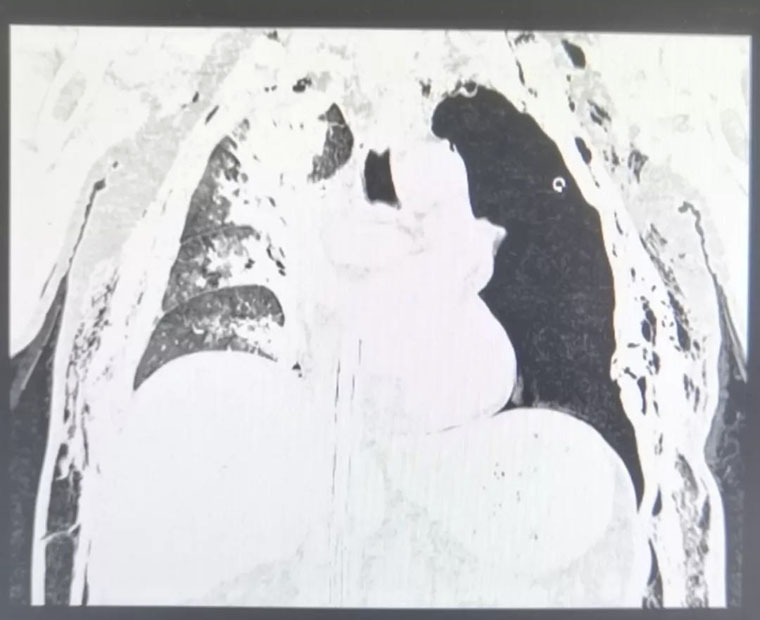 然而,大量的氣泡從胸腔閉式引流管噴出,我們意識到,這樣下去肯定不行,帶ECMO做CT檢查,再次請胸外科會診,討論手術(shù)的必要性。