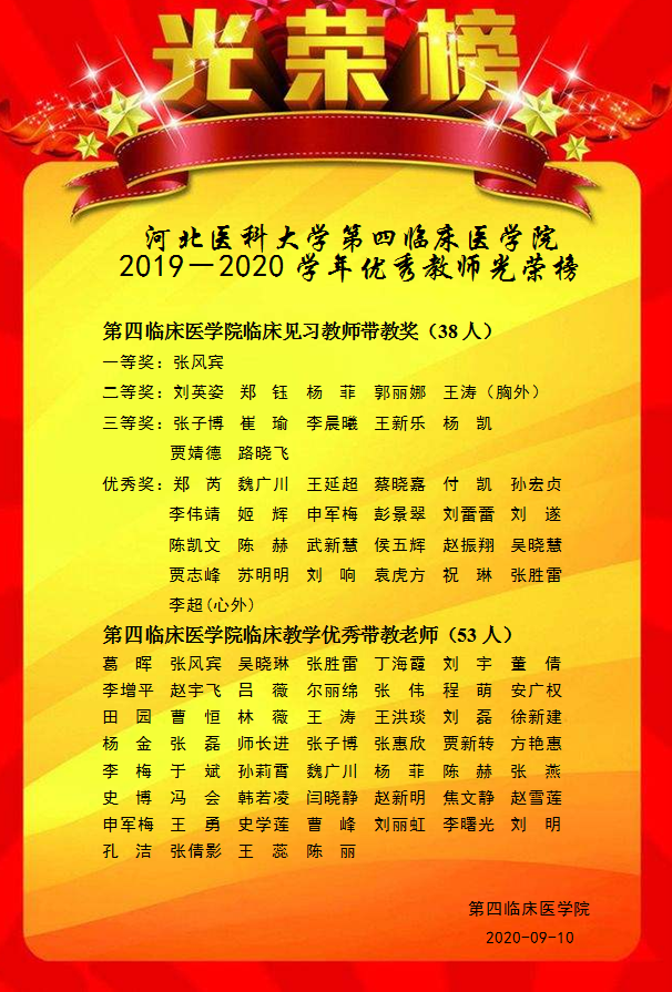 在第36個(gè)教師節(jié)到來之際,我院對(duì)2019-2020學(xué)年優(yōu)秀教師進(jìn)行了表彰,評(píng)選出第四臨床醫(yī)學(xué)院臨床見習(xí)教師帶教獎(jiǎng)38人,第四臨床醫(yī)學(xué)院臨床教學(xué)優(yōu)秀帶教教師53人,以此向默默耕耘在臨床教學(xué)一線的職工致以節(jié)日的祝賀和崇高的敬意。