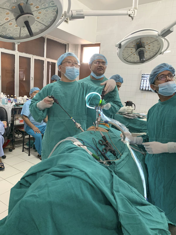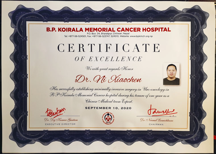 2019年3月,倪曉辰副主任代表我院參加第12批中國援尼泊爾醫(yī)療隊,抵達萬里之遙的尼泊爾B.P柯依拉臘紀念腫瘤醫(yī)院執(zhí)行援外任務。受援醫(yī)院位于尼泊爾中部奇達旺地區(qū),經濟落后、交通不便、生活條件差,雖然該院是尼泊爾最大和最有影響力的腫瘤醫(yī)院,但受限于國情且醫(yī)療水平與國內有很大差距。倪曉辰與尼爾曼院長(兼泌尿外科主任)積極深入交流,克服多種困難,竭盡所能地先后開展了腹腔鏡腎部分切除術、腹腔鏡膀胱根治性切除術、腹腔鏡前列腺癌根治術等多種高難度手術術式,填補了該院空白,并對該院醫(yī)生進行規(guī)范化手術培訓,培養(yǎng)了一支帶不走的醫(yī)療隊。
