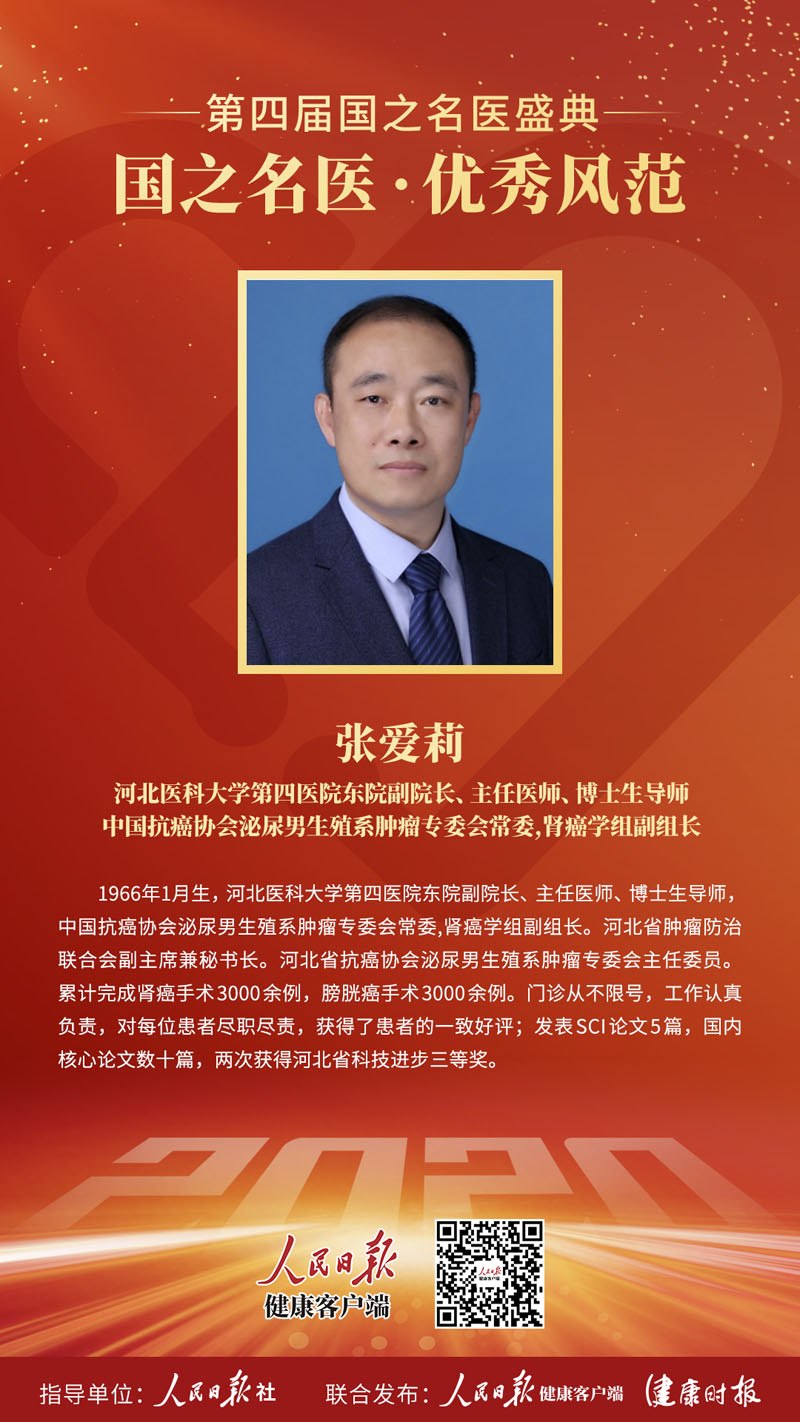 張愛莉副院長是主任醫(yī)師、博士生導師,中國抗癌協(xié)會泌尿男生殖系腫瘤專委會常委,腎癌學組副組長,河北省腫瘤防治聯(lián)合會副主席兼秘書長,河北省抗癌協(xié)會泌尿男生殖系腫瘤專委會主任委員。累計完成腎癌手術3000余例,膀胱癌手術3000余例。他門診從不限號,工作認真負責,一心一意對待病患,竭盡全力進行救治,在同事、患者中享有良好的口碑。他發(fā)表過SCI論文5篇,國內(nèi)核心論文數(shù)十篇,兩次獲得河北省科技進步三等獎,現(xiàn)承擔河北省科技廳重點研發(fā)計劃項目、河北省衛(wèi)健委科研課題及多項京津冀合作科研項目。