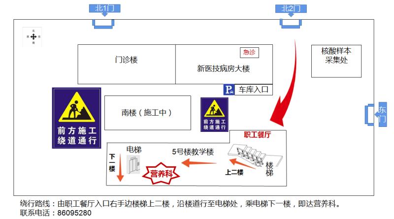 患者及家屬朋友們,因我院南樓管道連廊施工,教學(xué)樓(5號樓)前的主干道臨時封閉,如前往營養(yǎng)科,請根據(jù)下面示意圖繞行,由此給您帶來的不便,敬請諒解!