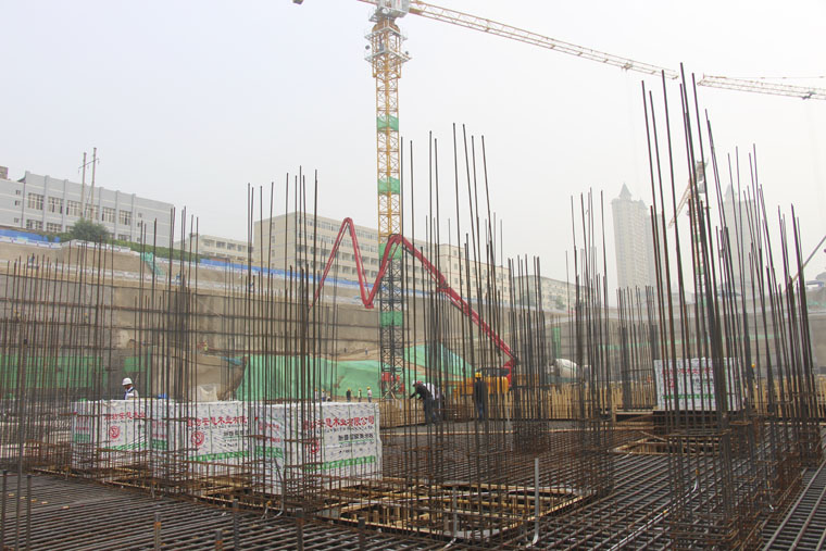 我院醫(yī)療綜合樓項(xiàng)目始終堅(jiān)持以質(zhì)量為本,高標(biāo)準(zhǔn)開展項(xiàng)目建設(shè),項(xiàng)目建筑基礎(chǔ)更是視為重中之重。工程主體結(jié)構(gòu)鋼筋總用量為19800噸;混凝土總用量11.5萬立方。其中基礎(chǔ)鋼筋最大直徑36mm,用量3221噸,占總用量的16%;混凝土用量28250立方米,占總用量的24%。根據(jù)基礎(chǔ)設(shè)計(jì)圖紙及施工方案,將基礎(chǔ)底板劃分為十三個(gè)區(qū)域,最大區(qū)域需連續(xù)澆筑混凝土3500余立方,用時(shí)70小時(shí)左右。