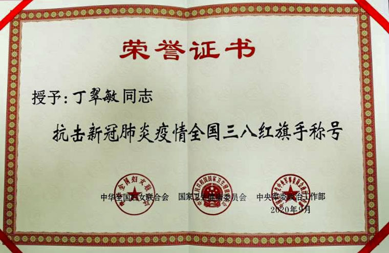 近日,抗擊新冠肺炎疫情全國三八紅旗手(集體)表彰云發(fā)布活動在北京舉行,全國婦聯(lián)、國家衛(wèi)生健康委、中央軍委政治工作部對相關個人和集體進行聯(lián)合表彰,我院呼吸內(nèi)科主任丁翠敏榮獲“全國三八紅旗手”稱號。作為從醫(yī)35年的呼吸科醫(yī)生和“SARS”遭遇戰(zhàn)的親歷者,丁翠敏再次奔赴救死扶傷、挽救生命的抗疫一線,于河北多地會診、救治危重患者,為疫情防控阻擊戰(zhàn)做出了應有的貢獻。