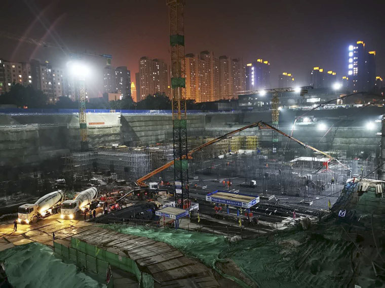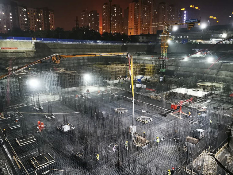 我院建設(shè)項目工程量大,基坑造型復(fù)雜,且施工地點處于負(fù)23.3米的基坑之中,施工難度較大。為順利完成此次超大方量基礎(chǔ)筏板混凝土澆筑,項目管理團(tuán)隊提前部署、周密策劃,積極組織協(xié)調(diào)。聯(lián)系商混站預(yù)先儲料,保證混凝土足額供應(yīng);提前規(guī)劃場內(nèi)外路線,與相關(guān)職能部門保持溝通,混凝土運輸順暢及時;認(rèn)真監(jiān)督基礎(chǔ)筏板澆筑全過程,保證混凝土澆筑按照施工規(guī)范保質(zhì)保量完成,切實做到了施工方案到位、材料供應(yīng)到位、技術(shù)服務(wù)到位、管理監(jiān)督到位。確保了本項目最大方量基礎(chǔ)筏板混凝土澆筑的順利收官,圓滿完成項目重大施工難點。