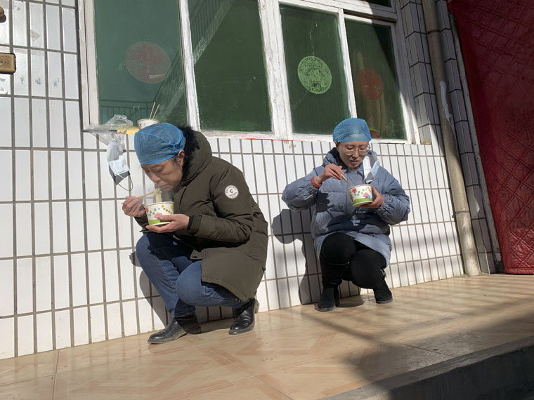 滿臉壓痕的李秀榮護士長和同伴蹲在墻角簡單吃了一小碗掛面,便繼續投入到工作中。
