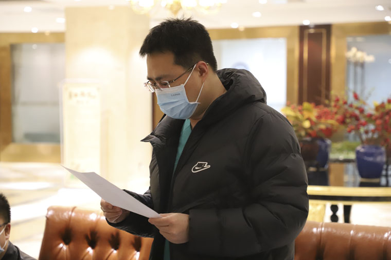 在定點醫院的每一天,伴隨我的是各種儀器設備24小時不停地運轉,我也像上了發條的陀螺,盡情地揮灑著已不再年輕的青春。期間,院領導們也經常打來慰問電話,給我們疲憊的精神注入新的活力。這支醫療隊里,二次“逆行”的不止我一人,但每個人都跟我一樣,將醫者的責任與擔當放在第一位。而我,除了是一名醫者,更是一名黨員。111日,醫院黨委研究決定,成立了我院援助省胸科醫院抗疫醫療隊臨時黨支部,由我任黨支部書記,申康康同志、李斌同志任支部委員。我肩負黨的責任與囑托,帶領大家重溫入黨誓詞,迅速形成戰斗力。