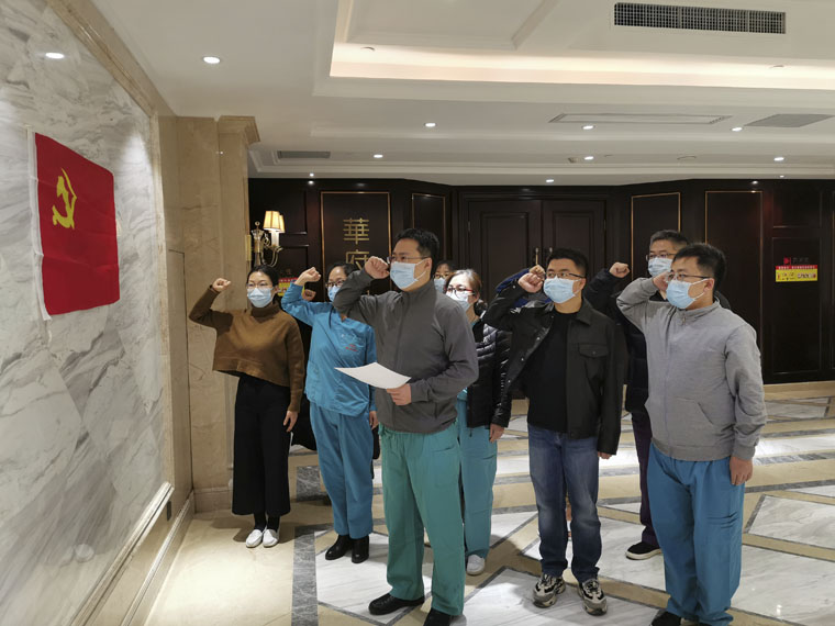 黨員同志們自覺將黨旗張貼在防護服最醒目的位置,提醒自己要時刻保持對黨的絕對忠誠、對人民高度負責的政治品質,堅定地站在疫情防控第一線,牢記初心使命,充分發揮硬核作用,當好防控疫情的先鋒隊、突擊手。同時,也讓患者能感受到黨和國家對他們的關心和照顧,要患者相信組織,相信黨,在我們的幫助下,他們一定會戰勝病魔,康復出院。