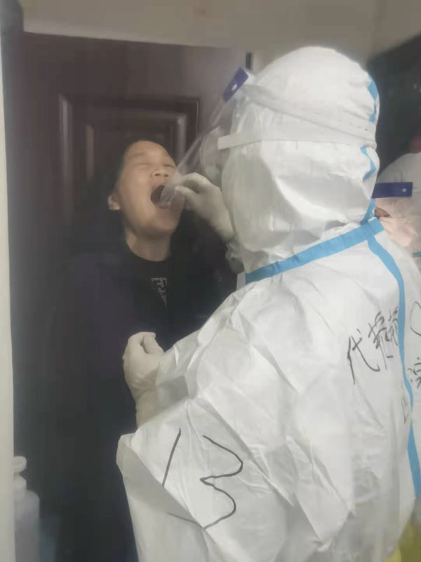 為了避免交叉感染,減少近距離接觸,隊(duì)員們盡可能不進(jìn)入屋內(nèi),在門口逐戶采集。小區(qū)內(nèi)獨(dú)居老人多,大多使用老年手機(jī)甚至不會(huì)使用微信注冊信息,導(dǎo)致采集工作進(jìn)行緩慢。隊(duì)員們有條不紊、逐一講解,有的用自己的手機(jī)幫助注冊,從而保證每位居民都能順利完成核酸檢測。在采集過程中,隊(duì)員們積極宣傳防疫知識(shí),對居民戴口罩進(jìn)行規(guī)范指導(dǎo)。透過防護(hù)口罩和面屏,隊(duì)員們說話的聲音變得有些沉悶,“別緊張,放松,頭再仰高一點(diǎn)......”,居民們對她們周到的服務(wù)連連感謝。晚上9點(diǎn),采集工作圓滿結(jié)束,共采集標(biāo)本3369個(gè)。隨后,又進(jìn)行試管清點(diǎn)核對、接收清點(diǎn)防護(hù)物資。當(dāng)回到住處時(shí),已到深夜11點(diǎn)多,很多人的腿酸疼得邁不開步子。