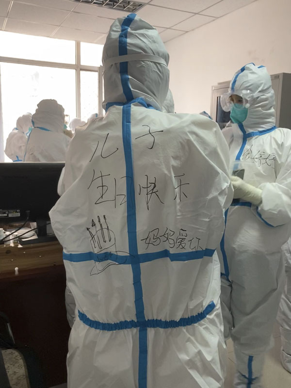 口泌外科的李云嬌從1月6日開始就一直參與核酸采集工作,她記不清有多少天沒有見到女兒和兒子了,今天是她小兒子的4歲生日,她把祝福寫在防護(hù)服上,讓這個(gè)別樣的生日更有意義。手術(shù)室徐欣華帶領(lǐng)隊(duì)員率先承擔(dān)高風(fēng)險(xiǎn)單元的采集任務(wù),同時(shí)還幫助其他小組分擔(dān)工作。由于上輪執(zhí)行核酸采集任務(wù)時(shí)氣溫太低,耳鼻喉科高超的手部出現(xiàn)凍傷,多年的腰疾也因著涼復(fù)發(fā),一度累得站不起來。此次,她還是勇敢地站在了外采的隊(duì)伍中。消化內(nèi)科的張茜,未告知大家剛下夜班,毅然加入到隊(duì)伍中。出征前,放療科張鈞主任醫(yī)師和耿文慧護(hù)士長還為本科室的張媛媛準(zhǔn)備了御寒棉衣。