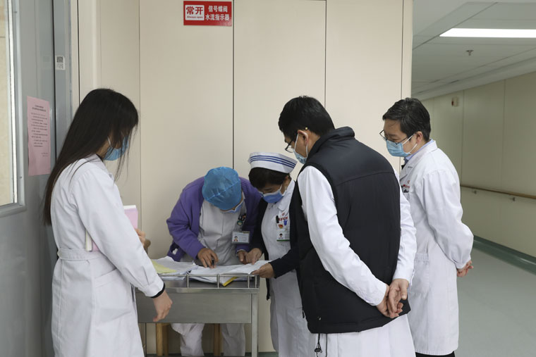 院領導一行查看了醫院預檢分診流程布局和工作人員落實相關要求的情況,之后進入婦科、消化內科、呼吸內科、全科醫療科、心外科、胸六科、胸三科、肝膽外科、外二科等病區和急診室等地,通過實地檢查、翻閱記錄和隨機提問等形式查看了科室封閉管理、患者及家屬管理與宣教、醫護人員手衛生、緩沖病房設置和院感防控知識培訓落實等情況。在督查過程中,院領導針對在院感防控工作中存在的問題,提出了具體可行的整改措施,督促相關科室限期整改到位。