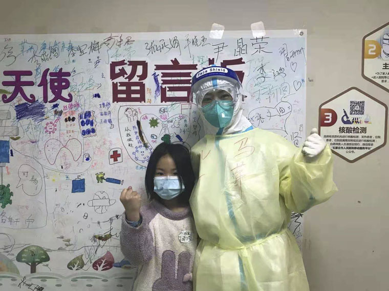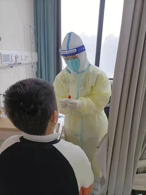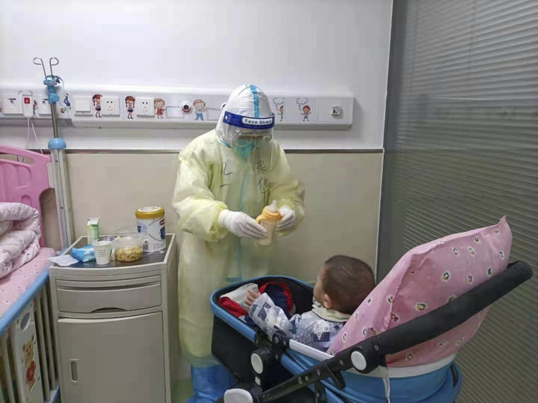 這支醫(yī)療隊(duì)中還有4位兒科的醫(yī)護(hù)人員,尚穎、戴若恒住院醫(yī)師和馬萍、張華主管護(hù)師。面對一線工作,尚穎和戴若恒兩位年輕醫(yī)師毫不畏懼、迎難而上,以最快的速度完成感控培訓(xùn),熟悉工作流程,投入到緊張的日常工作中,時(shí)刻關(guān)注孩子們的病情和心理變化。新冠兒科病房是沒有家陪的,為了照顧孩子們的情緒,病房的墻上貼滿了可愛的卡通人物圖片,醫(yī)護(hù)人員們也格外的耐心和細(xì)心。一張寫有“我是戰(zhàn)士,我是媽媽”的紅色條幅極其醒目。在這里,患兒們離開了媽媽,依然有歡聲笑語。馬萍和張華兩位主管護(hù)師每日除了完成自己的治療工作外,就像媽媽一樣照顧著這些孩子們的生活起居,喂奶、喂飯、喂藥、哄睡、換尿布、換衣服……每當(dāng)孩子們拉著她們的手,奶聲奶氣地說,“阿姨,你就像我媽媽”的時(shí)候,心里甜絲絲的感覺可以回味很久。