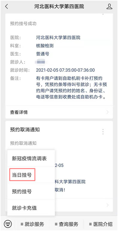 1、點擊公眾號“就診服務”,選擇“當日掛號”。