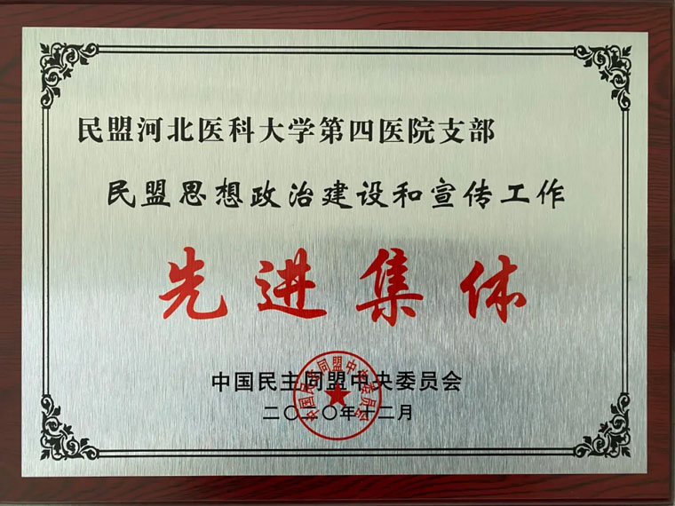 為表彰先進,推廣經驗,進一步加強民盟思想政治建設和宣傳工作,推動全盟思想政治建設和宣傳工作再上新臺階,2020年12月31日,民盟中央研究決定,對在思想政治建設和宣傳工作中取得突出成績的集體和個人進行表彰。石家莊民盟河北醫科大學第四醫院支部榮獲“民盟思想政治建設和宣傳工作先進集體”稱號。