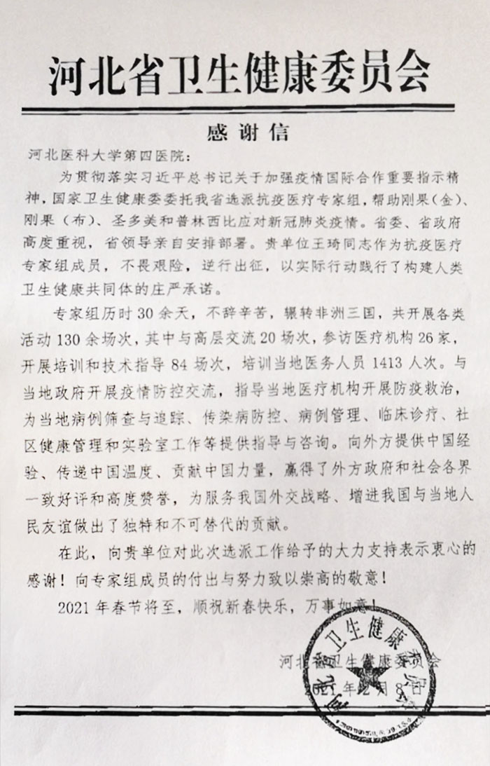 2021年2月8日,河北省衛生健康委員會對我院選派王琦同志作為河北省援非抗疫醫療專家組成員,幫助剛果(金)、剛果(布)、圣多美和普林西比應對新冠肺炎疫情表示感謝,稱贊王琦同志以實際行動踐行了構建人類衛生健康共同體的莊嚴承諾。