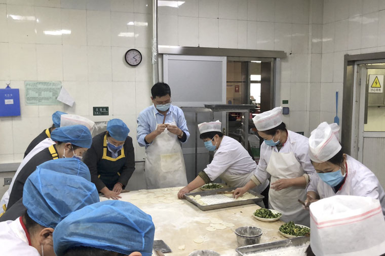東院膳食部廚師長李福震與大家熱火朝天地準備菜肴,他說:“這是我除夕夜堅守崗位的第27年,非常有意義,希望石家莊早日徹底戰勝疫情!”