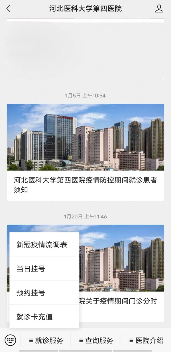 1. 河北醫科大學第四醫院微信公眾號選擇就診服務” → 預約掛號