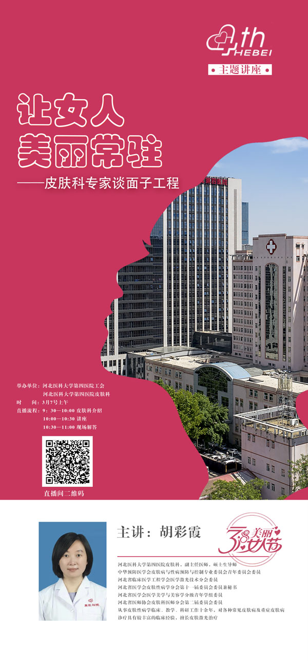 在第111個“三八”國際婦女節到來之際,為了更好地關愛女職工和女性同胞,工會攜手皮膚科于37日上午開設“云課堂”惠及女職工。皮膚科主任王文氫簡單介紹了我院皮膚科的各種業務和設備,隨后,擅長皮膚激光治療的胡彩霞老師以“讓女人美麗常駐——皮膚科專家談面子工程”為題進行講座,她用通俗易懂的語言為女性朋友傳授如何認識膚質、正常皮膚如何護理等知識,并介紹了女性皮膚護理常見問題,黃褐斑、玫瑰痤瘡的診斷及治療等。