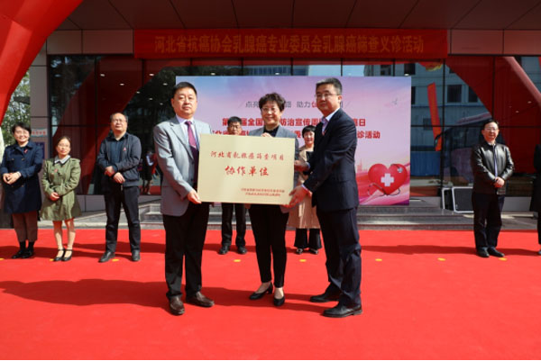 4月15-21日是我國第27個全國腫瘤防治宣傳周,今年宣傳周的主題是“點亮抗癌之路,助力健康中國”。4月18日,由河北省抗癌協會乳腺癌專業委員會牽頭,我院乳腺中心專家攜超聲科、影像科及病理科專家于沙河市人民醫院舉行第27屆全國腫瘤防治宣傳周大型義診、科普宣傳活動及“河北省乳腺癌篩查項目協作單位—河北省乳腺癌篩查培訓基地”授牌、揭牌儀式。河北省抗癌協會副理事長、乳腺癌專業委員會主任委員、我院副院長耿翠芝教授等乳腺癌相關專家與沙河市人民醫院相關領導出席活動。