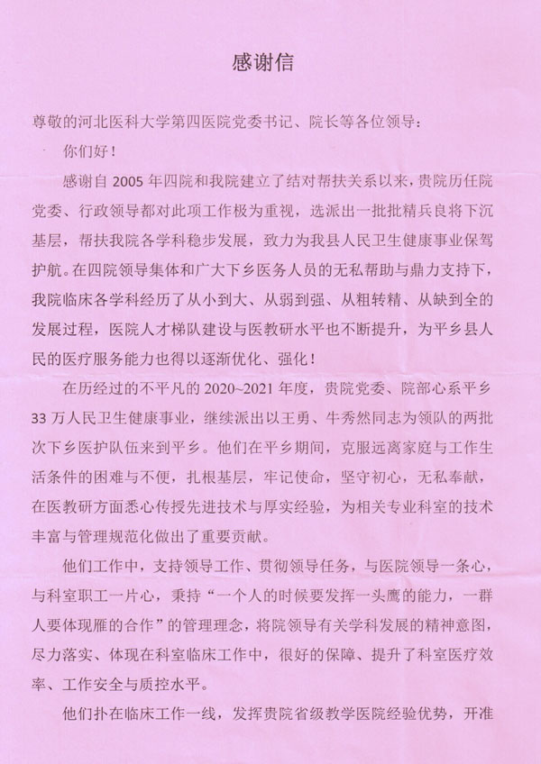 平鄉縣與我院的情誼結于2005年,是我院最早的基層幫扶單位之一。多年來,我院派駐的醫務人員從少到多、從短期到長期,至今已近百人,基本涵蓋了全部醫療學科。為感謝我院對當地一直以來的傾心幫扶與突出的成績,平鄉縣人民醫院對上述幫扶隊員進行通報表揚,授予了集體與個人的幫扶先進榮譽稱號,并給我院送來了感謝信。這是既是對我院幫扶工作的肯定,更承載著兩院長期以來所建立的深厚感情。