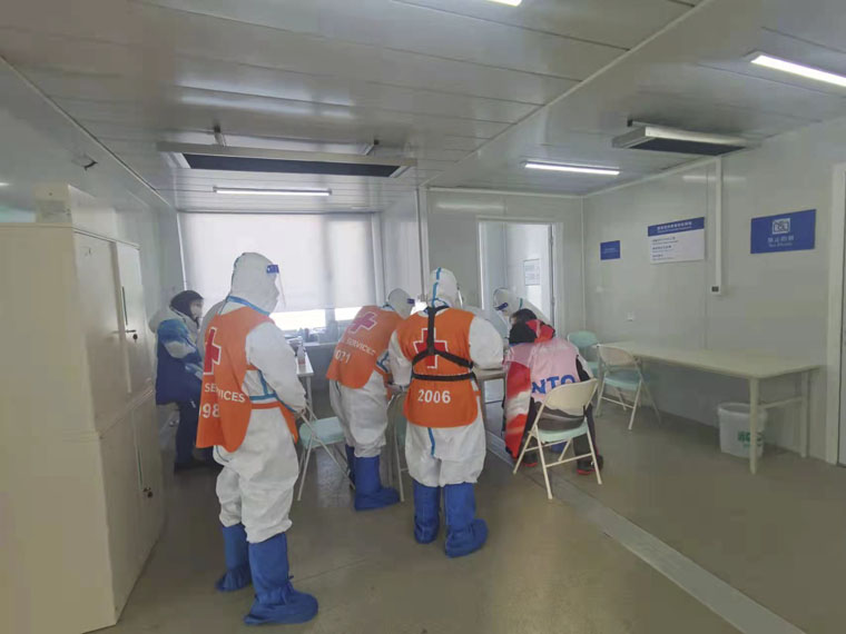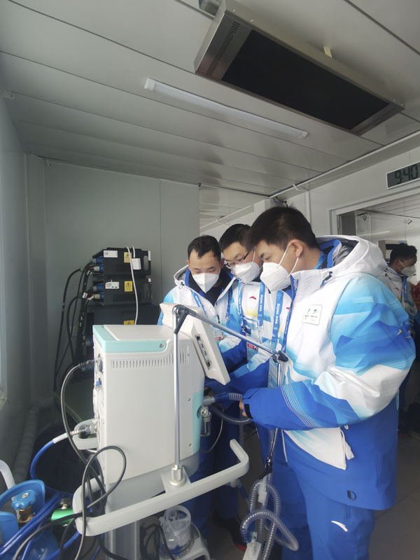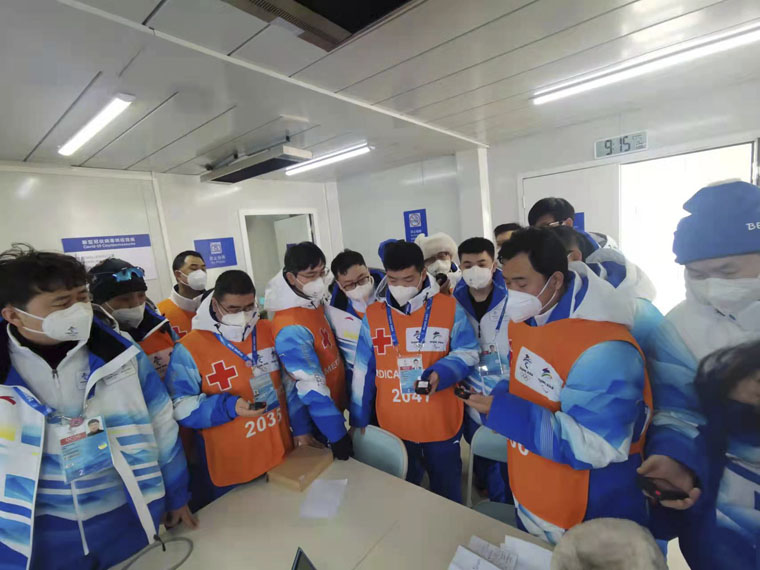 在冬季兩項運動員醫療站,我院冬奧醫療保障隊員分工合作,迅速開展醫療設備及防疫物資(包括急救藥物、急救擔架、醫用外固定支具、心電監護儀、呼吸機、電除顫儀、醫用消毒劑、醫用隔離衣及防護服、醫用防護面屏、醫用外科口罩、通訊手臺、視頻記錄儀等)的組裝、整理與搬運工作。大家嚴格遵守新冠疫情防控政策,按照醫療救治服務保障運行腳本,在運動員醫療站、觀眾醫療站、FOP1、2、3、4醫療站模擬進行了多場冬奧會倒計時階段的沖刺保障演練。