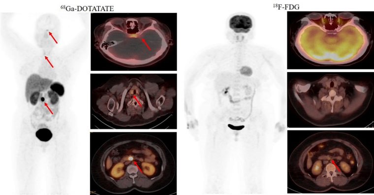 首個病例患者為一名49歲的女性,間斷低血糖超過1年,甲狀旁腺激素檢查異常升高。腦MRI提示為腦垂體微腺瘤,上腹部MRI檢查未發現明顯異常。但臨床懷疑胰腺存在病變,經新探針68Ga-DOTATATE PET/CT檢查,發現了胰腺病灶,綜合診斷多發性內分泌瘤病I型(MEN1型)。經胰腺穿刺病理證實為神經內分泌腫瘤G2。68Ga-DOTATATE及18F-FDG PET/CT雙核素的檢查結果為患者臨床精準診療提供了胰腺病灶的影像學證據。