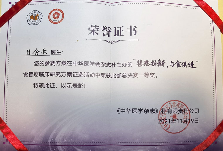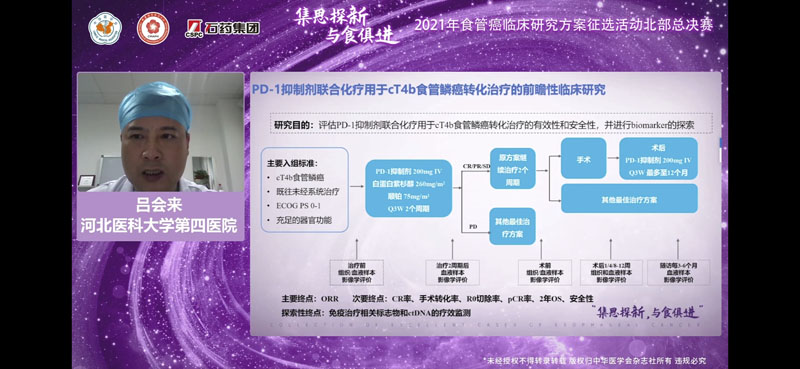 本次賽事分南、北兩大賽場,幾乎涵蓋全國所有省份,北部賽區涉及10余個省份,旨在搭建食管癌領域專家交流平臺,促進食管癌領域整體醫療水平的提高。在河北賽區、北部大區的比賽中,呂會來副主任均順利晉級。2021年11月19日,北部總決賽在線上拉開帷幕,由中國醫學科學院腫瘤醫院李印教授、黃鏡教授及江蘇省人民醫院束永前教授擔任大會主席。來自中國醫學科學院腫瘤醫院、哈爾濱醫科大學附屬腫瘤醫院、空軍軍醫大學唐都醫院、重慶醫科大學附屬第二醫院、河南科技大學第一附屬醫院和我院的7名選手參加,均為上一輪各大區賽晉級選手。所有選手要求完成15分鐘的PPT演講,之后,來自國內20余家醫院的30多名腫瘤領域相關專家進行提問、點評、打分。