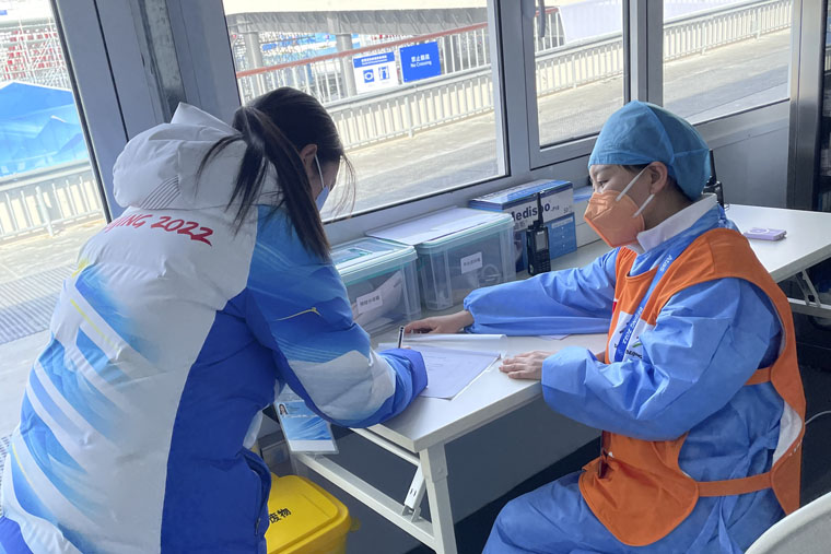 為了便于醫療保障隊更好地開展工作,院黨委成立了冬奧醫療保障隊臨時黨支部,李崢擔任支部宣傳委員,配合醫療官何宏濤副院長,協助完成環外團隊的學習、工作和生活。剛到觀眾醫療站的前幾天,工作需要盡快鋪開,任務繁瑣且艱巨。她與大家一起在醫療站有限的場地內,整理醫療物資、核對救治藥品、優化工作流程、檢查各種儀器、模擬演練。回到宿舍則要總結一天的工作,接發生活物資,與醫院宣傳部老師溝通收集宣傳資料,接收傳達多種信息,包括每日的賽事通知、擺渡車輛安排、每日排班、宿舍管理規定、網絡培訓資料等。每當晚上打開視頻想與孩子聊天時,往往是孩子們都睡了,只好反復看著手機相冊里的照片。后來,待工作理順了,才得以有時間與兩位“留守兒童”視頻,一天的疲勞一掃而光。