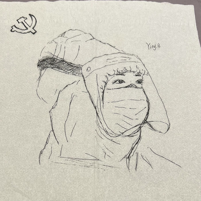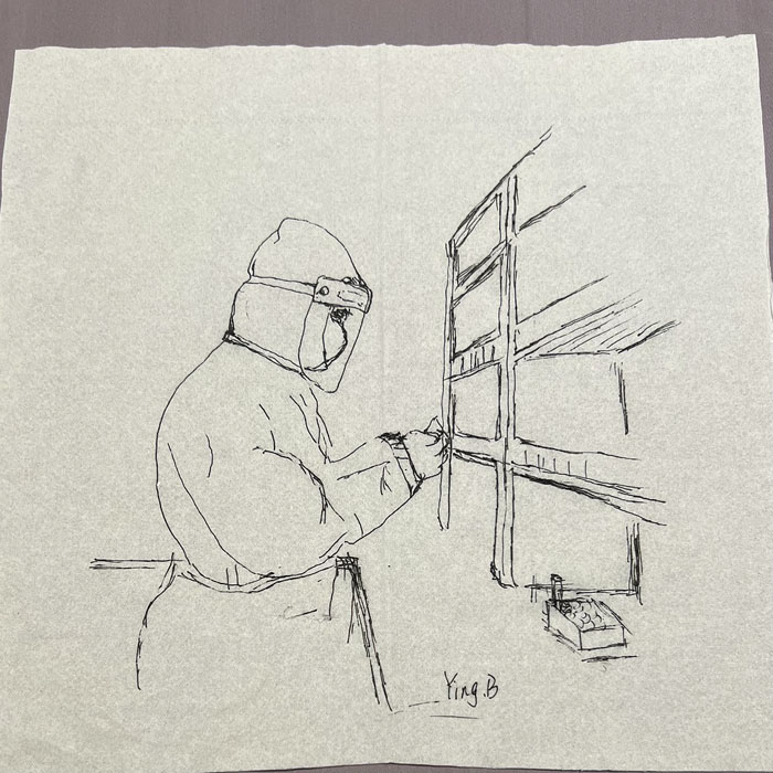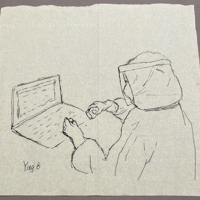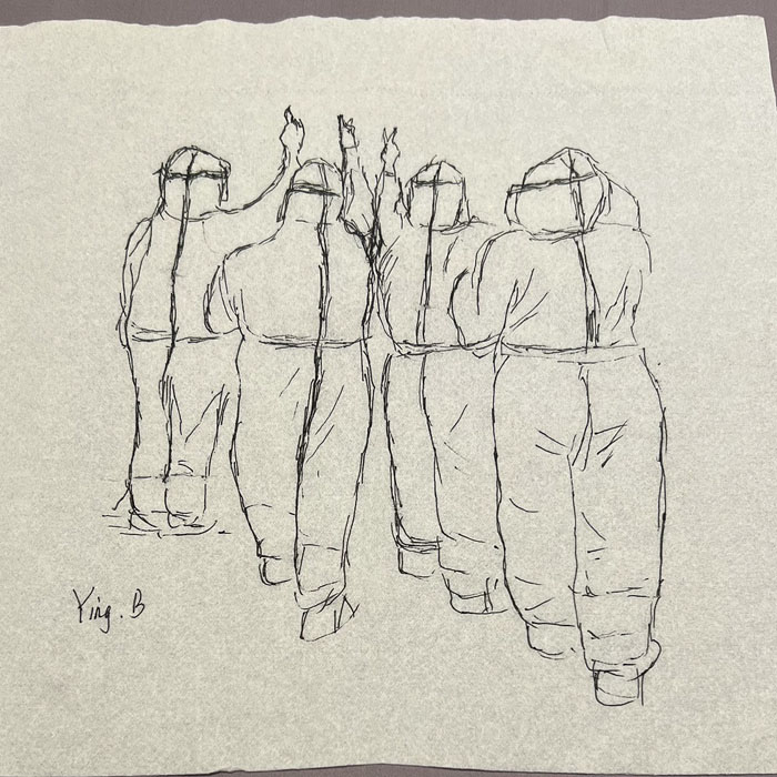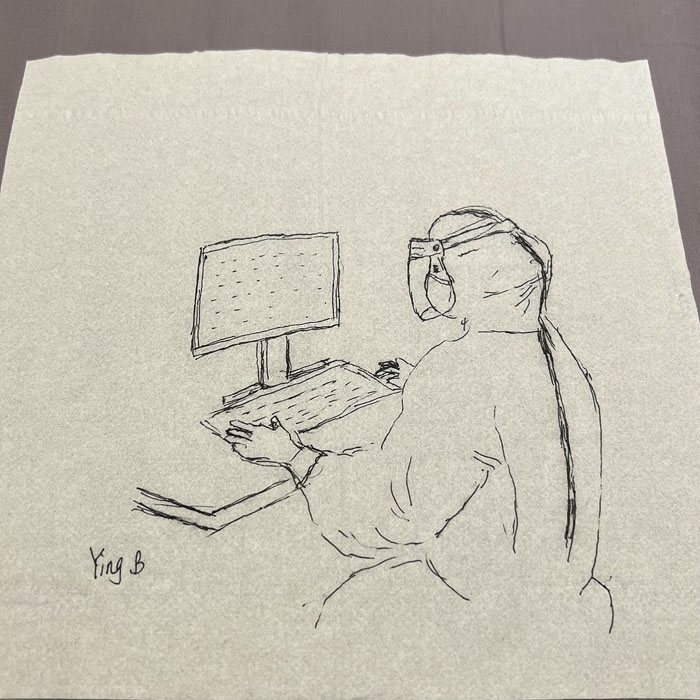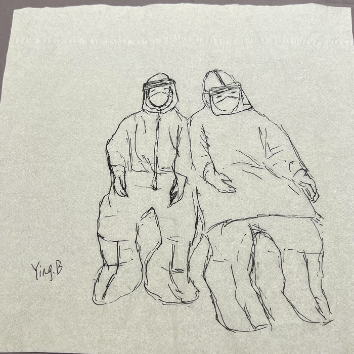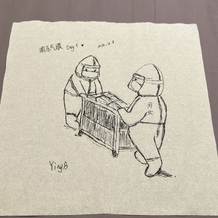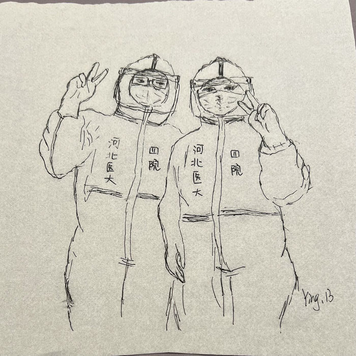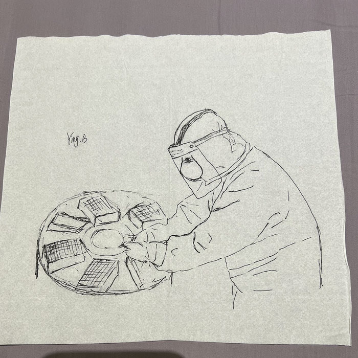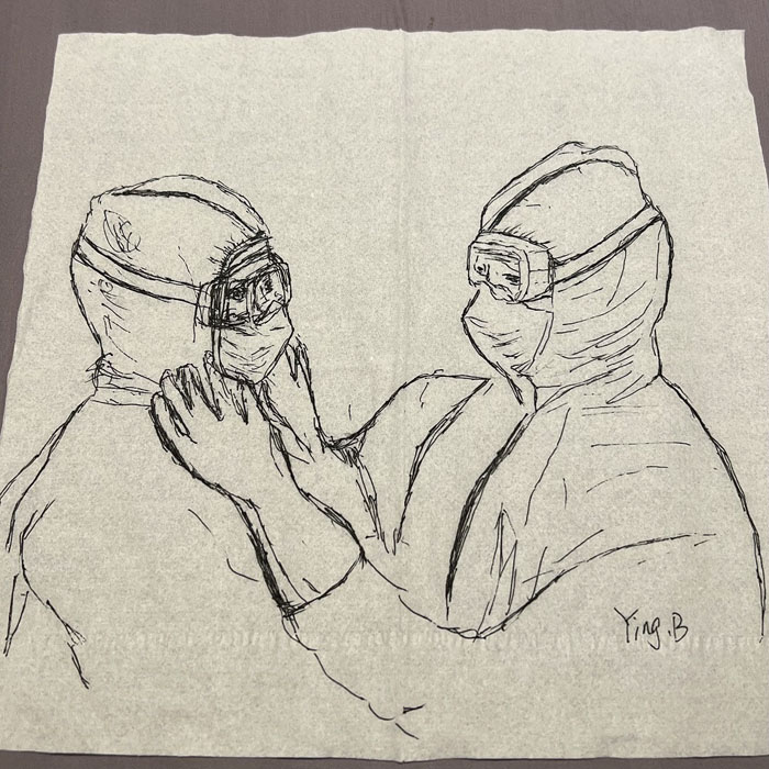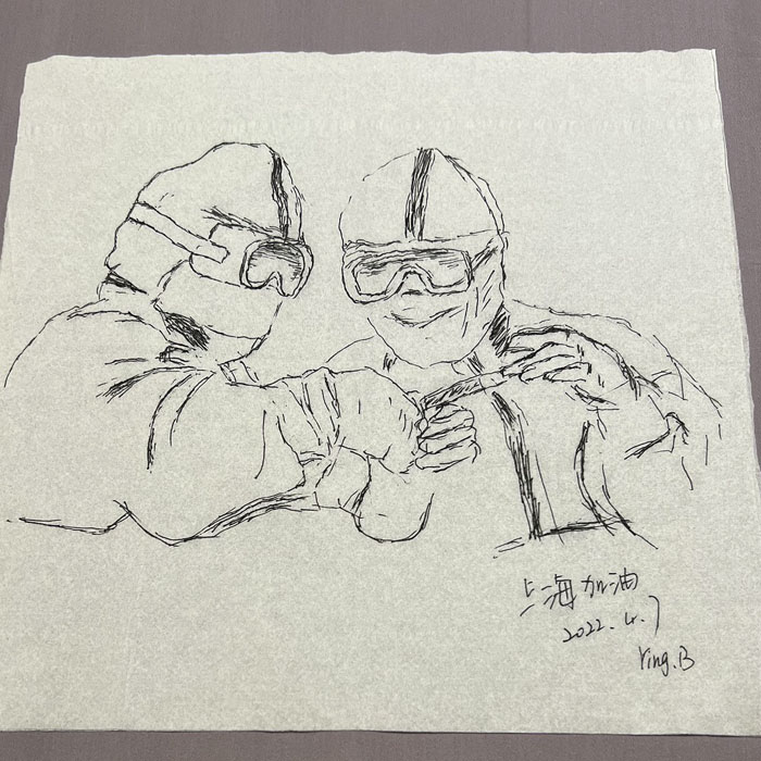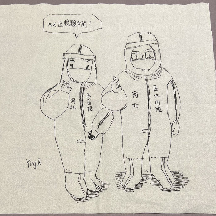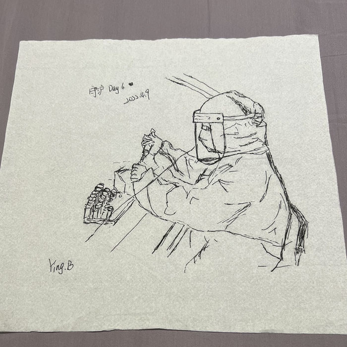 我院檢驗科的馬鳴、巨英博、王霏霏、王姿4名共產黨員及劉丹(入黨積極分子)、米培、武一鵬、張旭威共8名業務骨干,第一時間報名參戰。他們當中,副高職稱1名、中級職稱5名、博士2名、碩士3名,均有參加大規模核酸檢測的實戰經驗。巨英博同志在繁忙的工作后,利用休息時間在簡陋的紙巾上“作畫”,記錄下平凡而偉大的瞬間。