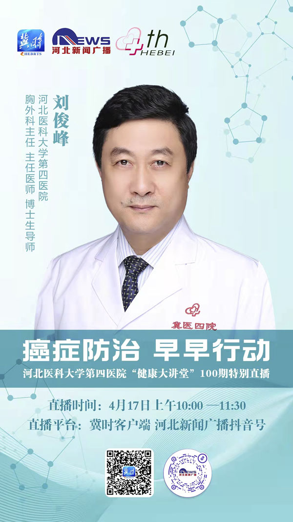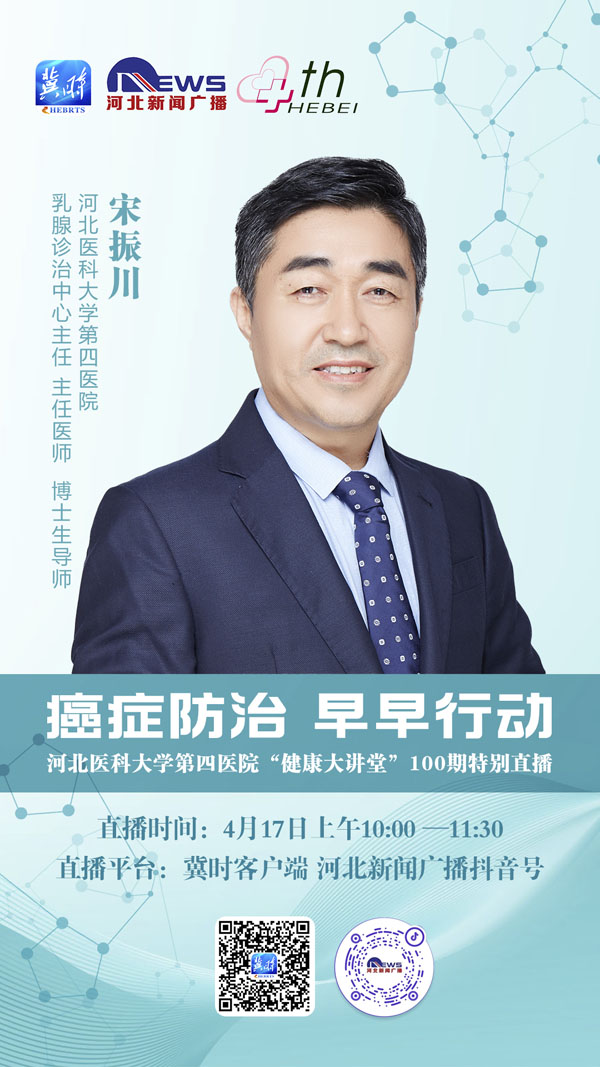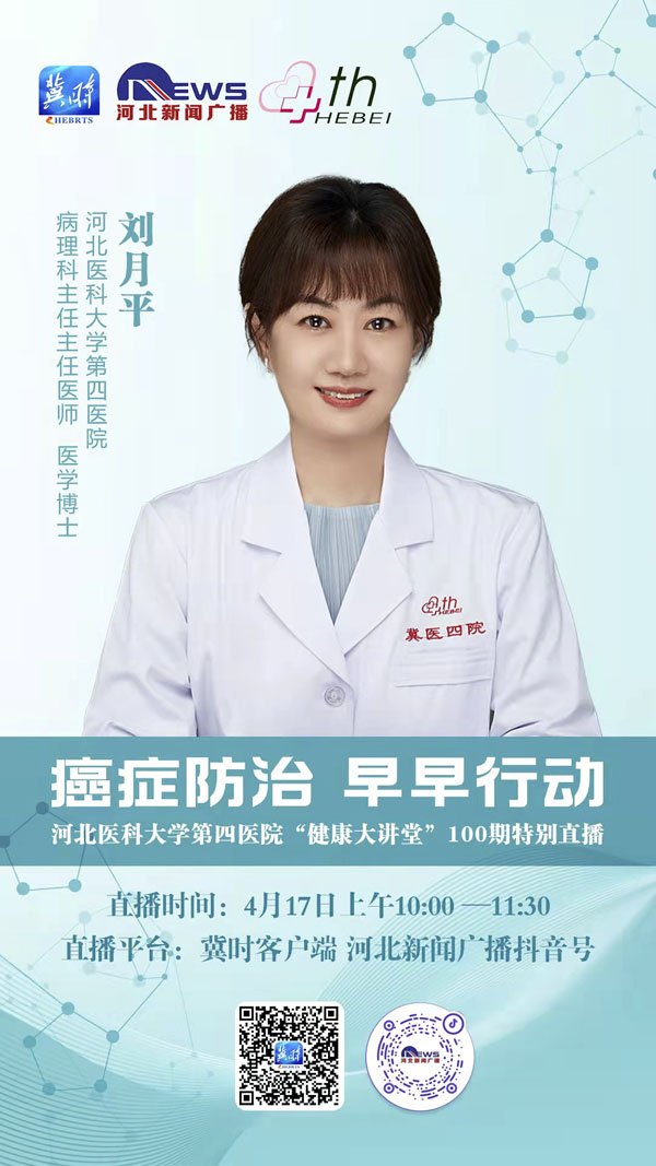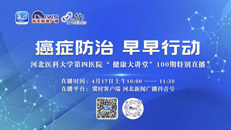 肺癌有哪些早期癥狀?乳腺癌如何篩查?病理結果怎樣才能看得懂呢?在第28個全國腫瘤防治宣傳周到來之際,417日,我院與河北廣播電視臺新聞廣播《燕趙大醫生》共同推出:癌癥防治,早早行動——河北醫科大學第四醫院“健康大講堂”第100期特別直播活動,特別邀請了胸外科主任劉俊峰教授、乳腺診治中心主任宋振川教授、病理科主任劉月平教授。三位權威大咖普及腫瘤防治知識,“云義診”為大家在線答疑解惑。