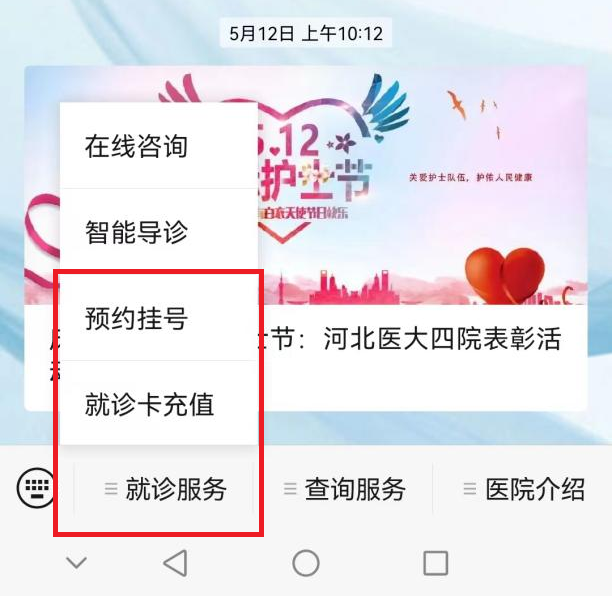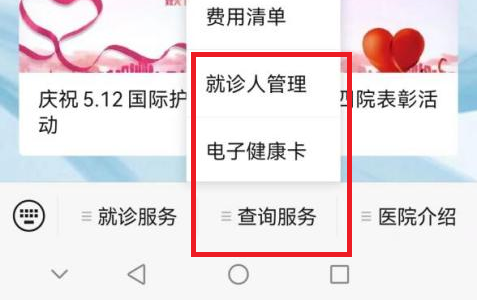 申領完電子健康卡后,可以在醫院微信公眾號中“就診服務”菜單下的“預約掛號”、“就診卡充值”進行預約、充值業務。